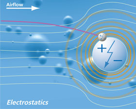 Electrostatic Effect: Electrostatic fields are installed as plate condenser as an active filtration element. Alternatively, they can be preloaded onto the fibers of synthetic filter media. Thus, around the fibers or collectors respectivly an electric field will form, which will attract complementary charged particles. Precharged electrostatic within the fibers will abate after the filter’s initiation.