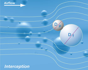 The speed of the air stream has no effect on interception as long as it doesn‘t change the fiber‘s shape. The bigger the particle, the smaller the fiber and the gap between them, the more effectively interception works. Meaning: The filter media should contain lots of small fibers of the same diameter as the particle to be adhered.